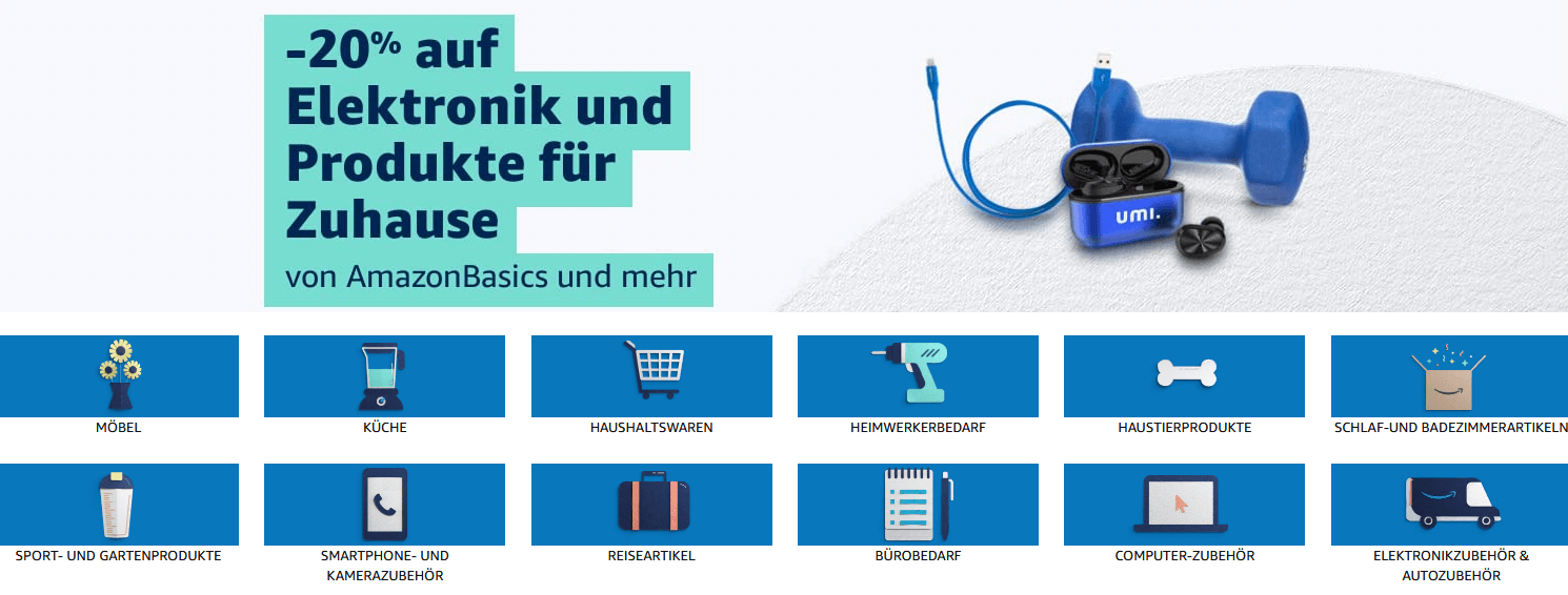 Du erhälst bis zu 20% Rabatt auf ausgewählte Amazon Produkte in den Bereichen: Möbel, Küche, Haushalt, Heimwerkerbedarf, Haustierprodukte, Schlafzimmerartkiel, Badezimmerartikel, Sportprodukte, Gartenprodukte, Smartphone-Zubehör, Kamera-Zubehör, Reiseartikel, Bürobedarf, Computer-Zubehör, Elektronik-Zubehör, Auto-Zubehör
