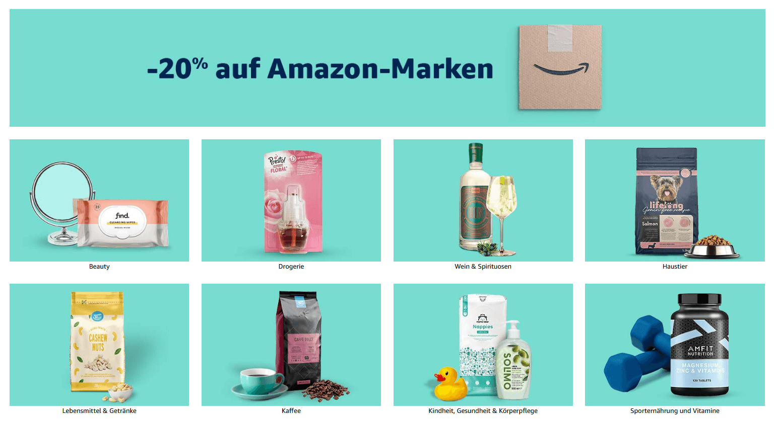 Du erhälst bis zu 20% Rabatt auf ausgewählte Amazon Produkte in den Bereichen: Beauty, Drogerie,Wein, Spirituosen, Haustier, Lebensmittel & Geträke, Kaffee, Kinder, Gesundheit, Körperpflege sowie Sporternährung und Vitamine.