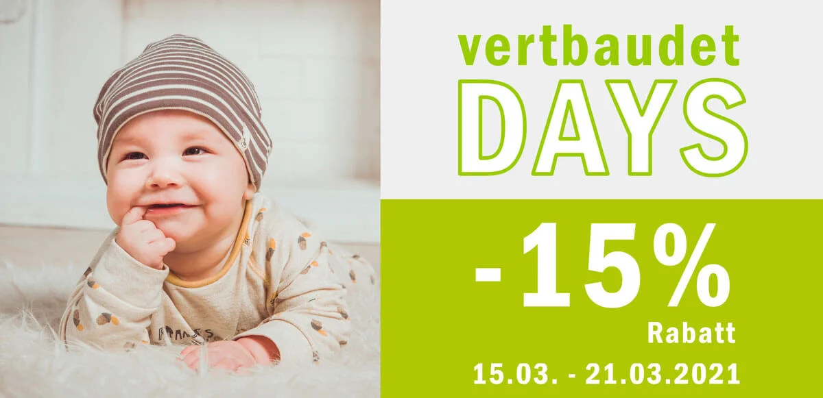 Sicher dir von Montag den 15.03. bis Mittwoch den 17.03. einen satten vertbaudet Rabatt von 15 % auf Babyprodukte.